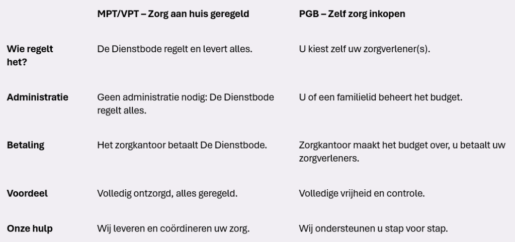 Als u de indicatie ontvangt, kunt u kiezen hoe u de zorg wilt ontvangen: via een Modulair/Volledig Pakket Thuis (MPT/VPT) of via een Persoonsgebonden Budget (PGB).